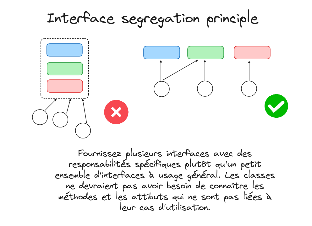 Ce principe stipule qu'il est préférable de diviser une interface offrant plusieurs méthodes en plusieurs interfaces, chacune contenant moins de méthodes (idéalement une seule), avec un champ d'application très spécifique et précis. Cela permet de favoriser la réutilisabilité du code et d'assurer que chaque classe implémentant ces interfaces soit hautement cohésive (c’est-à-dire des fonctions étroitement liés et des responsabilités claires), possédant un comportement et un ensemble de responsabilités bien définis.