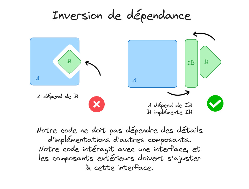 Elle stipule que notre code ne doit pas dépendre des détails d'implémentation d'autres composants. Au lieu de cela, notre code interagit avec une interface, et il incombe aux composants extérieurs de s'adapter à cette interface.
