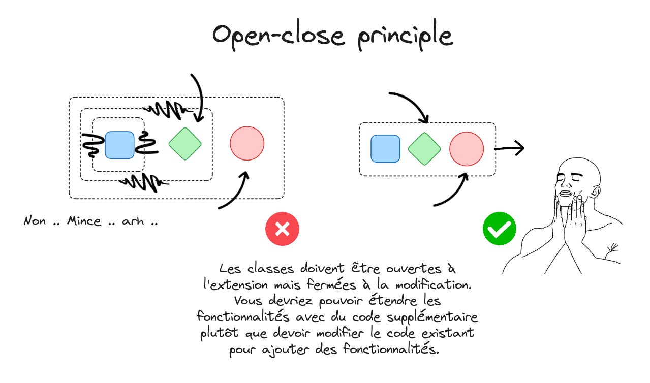 Le principe Ouvert/Fermé (OCP) stipule qu'une classe doit être à la fois ouverte à l'extension et fermée à la modification, ce qui peut paraître contre-intuitif mais je vais vous détailler ça.
