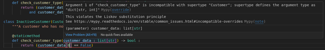 avec un type d’entrée différent, Mypy nous signalera que nous violons le principe de substitution de Liskov :